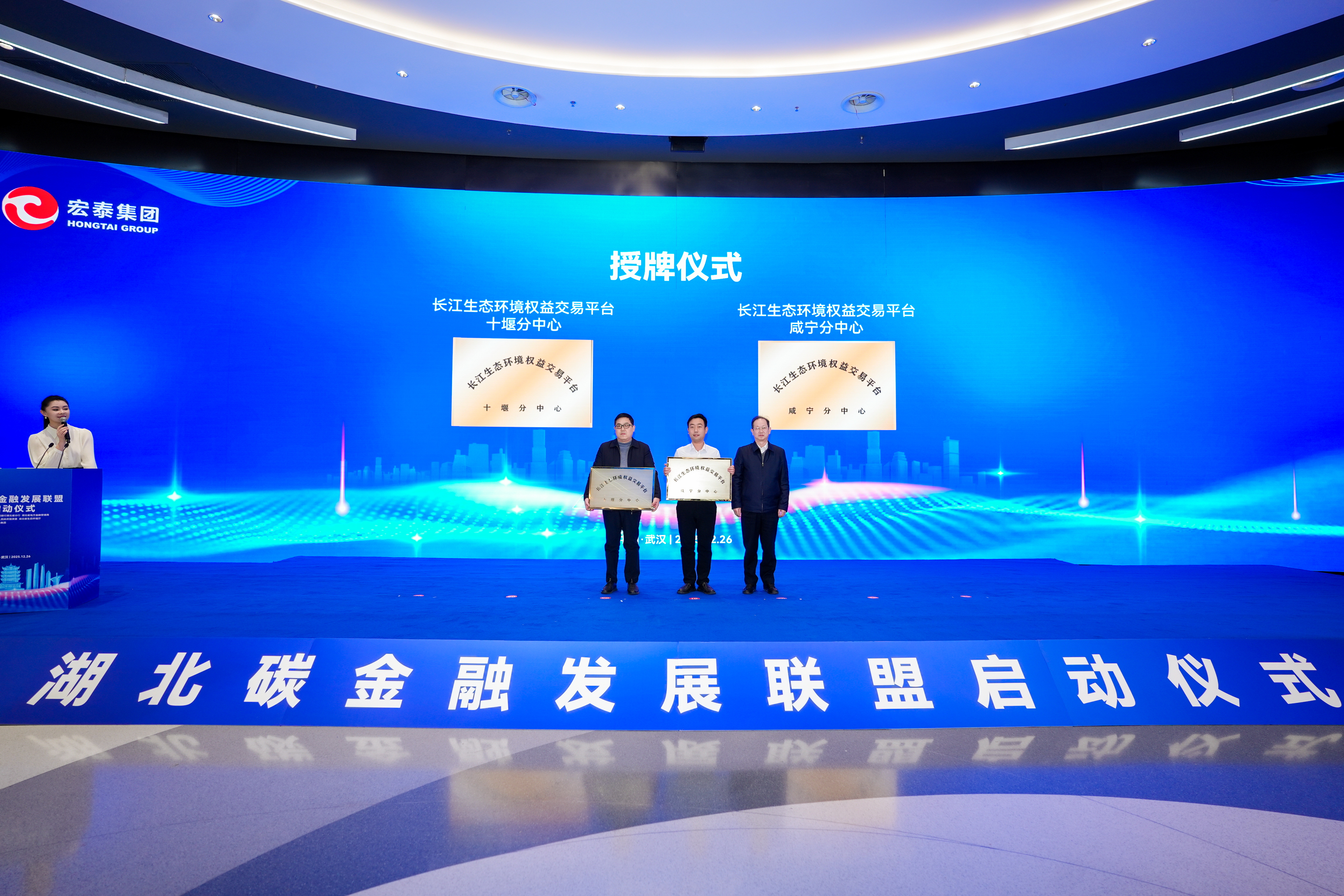 12月26日上午,在湖北省國資委、省地方金融管理局、中國人民銀行湖北省分行及省生態(tài)環(huán)境廳的聯(lián)合指導與推動下,由湖北宏泰集團牽頭組建的“湖北碳金融發(fā)展聯(lián)盟”正式宣告成立。成立大會上,省生態(tài)環(huán)境廳二級巡視員田啟代表聯(lián)盟及省級平臺,向咸寧城發(fā)集團旗下綠色產(chǎn)業(yè)發(fā)展投資有限公司授予“長江生態(tài)環(huán)境權(quán)益交易平臺咸寧分中心”牌匾,綠產(chǎn)公司總經(jīng)理吳成代表公司接受授牌。